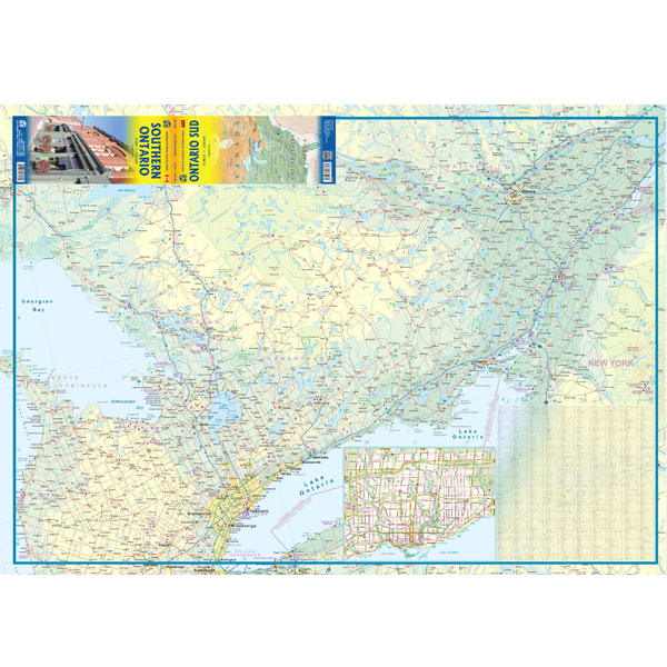 The Canadian province of Ontario is intimidatingly large. It is also mostly tundra with extremely few settlements and few roads; in fact, the geographic centre of Ontario is about 1,500 kms north of the nearest road. The very first map I prepared, at age 10, was of Ontario; and it took me six weeks to trace all the lakes. My point is that the developed portion of the province is a much smaller wedge of fertile ground south of the mineral belt of the Great Canadian Shield. This double-sided map focusses on the area south of Sudbury and North Bay and expands the scale to a much more useful purpose for most users. Imagine Detroit in the southwest corner of the map, with Highway 401 joining it to London and Toronto and a branch motorway cutting across to Buffalo. Add in the Bruce Peninsula and the major routes north to cottage country and you have side one. The other side stretches from Toronto east to the Quebec border and Ottawa, with the lovely Kawarthas region for exploring. My personal favourite highway is Number 7, from Peterborough east through land settled two hundred years ago by Scottish Gaels. Perth is a perfectly preserved Scottish town of granite buildings. The map also includes a regional map of the main roads in the greater Toronto area and a separate inset of the downtown.